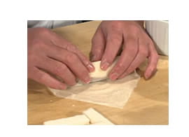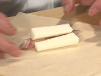 大ぶりに切った長芋2本と、下味をつけたサワラとを 左記のように並べて、一緒に春巻きの皮で端から 巻いていきます。こうして長芋と一緒に春巻きの皮で 包み込んでおけば、油で揚げたときに逃げちゃうはずの 魚の栄養(DHAやEPAなどのサラサラ成分)も、 長芋が吸ってくれます。