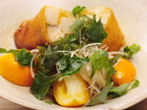 揚がった春巻きを切り、白髪ネギ、金柑を盛り付けます。 そして芽カブを上にかけます。 最後に大葉を手でちぎって乗せてください。 包丁でやるより手でちぎった方が大葉の香りの立ちが いいんですよ。下味はついてますが、最後にポン酢を 適量回してかけていただければ、完成です。