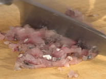あとでタルタル風に混ぜたいので、挽いたようになるべく 細かく包丁でたたきましょう。 ただし完全に潰れたミンチ状になってしまうと あまりキレイではないので、適度がいいですね。