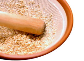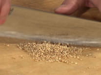 香りも味も良くなるので、胡麻も入れるのですが、 そのままではいけません。 胡麻は硬い殻に覆われているので、刻んだりすったりして あげるといいです。 そうすることで、健康にいい栄養の吸収が良くなるのです。 今回は包丁で刻みます。刻んだ途端にすごくいい香りが しますので、より食欲が増しますよ。