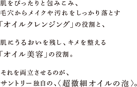 すぐに立ち上がる高機能な濃密泡で肌を包めば、 クレンジングから洗顔まで、すべてが完了してしまう。 <超微細オイルの泡>という新しい技術で、うるおいを守りながら、すっきり落とす、 年齢を重ねた肌にふさわしい極上の洗顔タイムを演出します。