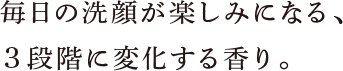 ハーブ系の香りから、 グリーンフローラルの甘くやさしい香りに変わり、 最後は柑橘系の爽やかな香りに変化して、 洗顔タイムをアロマの心地良さで演出します。