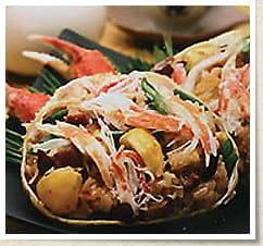 さて、松葉ガニの地元ならではの食べ方はというと“松葉ガニのあらい”が有名。とれたての生の松葉ガニを氷水につけると、花が咲いたように身が反り返り、ぷりぷりした食感と甘さが口いっぱいに広がります。また、熱々のゆでたても、旨みたっぷり、まさに王者の味覚。手に持って、重量感があるものを選びましょう。そのほか、野菜やきのこと一緒にいただく鍋物は、ビタミン類もプラスされ、栄養バランス的にもおすすめです。