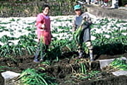 兵庫県中央部に位置する山間の町朝来町。この地の特産「岩津ねぎ」は、白ねぎと青ねぎとのちょうど中間種で、 みずみずしく滋味豊富なことで知られています。その歴史は古く、江戸時代、隣町の生野代官所の役人が京都に出向いた際に、 「九条ねぎ」の種を持ち帰ったのが始まりとされています。