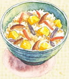 近年は、輸入物も多く出回っていますが、大粒で甘い旬のニホングリを使った栗ご飯はやはり格別。栗には、米の糖質をエネルギーに換えるために必要なビタミンB1が多く、ほかにもビタミンC、食物繊維などが含まれており、丈夫な体作りを支えてくれます。