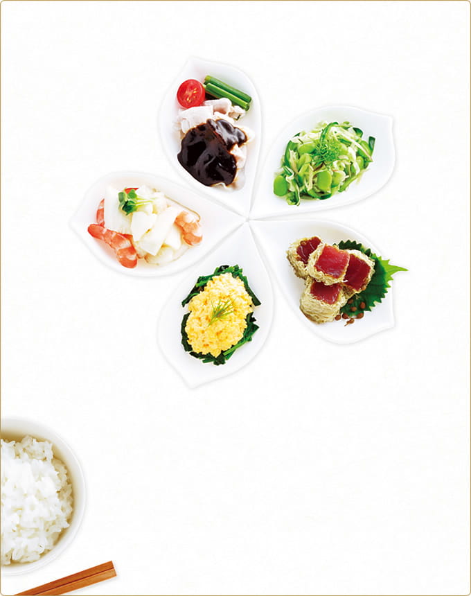 そこで、毎日の食事を考える時、ぜひ取り入れていただきたいのが、五つの味と五つの色がそろう「五味五色」の献立です。様々な食材を使った、「五味五色」の献立なら、栄養のバランスも自然に整います。