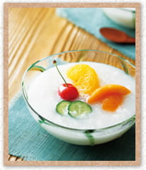 現在、秋田県内各地で食べられている『あさづけ』は、地元特産のサクランボなど旬の果物を贅沢にトッピングすることもあり、さながら甘酸っぱい和風デザートのような趣で、子どもからお年寄りまで人気があります。