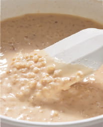 玄米ごはんは牛乳で煮るのでやさしい口あたりに。その生地に野菜や肉・魚介類、きのこ類、チーズ、フルーツ、ナッツ類など、お好みの具材をプラスすれば、様々な味のバリエーションが楽しめます。