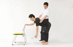 背に置く。一歩後ろに下がって、足を肩幅に開く。膝を軽く曲げ、