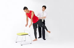ケガの原因になりますので、後ろに蹴る動作は、腰が反らない範囲で行います。