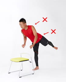 椅子に寄りかかりすぎて、上体が前に倒れないようにしましょう。また、骨盤を外側に捻らないように、体は前に向いた状態で行います。