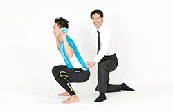 スクワット動作では、背中が丸まらないように注意しましょう。