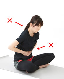 慣れるまでは手のひらで軽くお腹を押すようにして、一気に吐く呼吸を意識づけしましょう。息を吐くと自然に吸うので、吸う呼吸を意識する必要はありません。