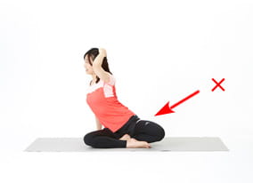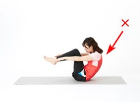 脚を伸ばしたときに腰が反ったり、骨盤が開いたりしないよう、お腹に意識を向けましょう。頭と膝を引き寄せるときは、重心が後ろへかかり過ぎないように気をつけます。