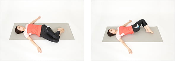 仰向けになり、両膝を立てる。両手は腰から離れたところで手のひらを床に向けておく。両肩が床から離れないように注意して両膝を左右に倒し、お腹の前や脇腹、腰まわりの状態をチェックしよう。