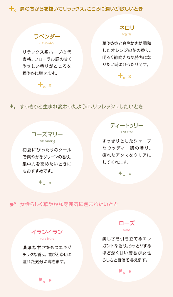 そのときどきの気分にあわせて、精油を使い分けるのもポイント。