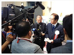 この場で、サントリーホールディングス(株)代表取締役副社長 鳥井信吾は「異分野と交わる領域に、イノベーションが起こると考えている。関西の学術エリアであるけいはんな学研都市で、多くの研究者たちとつながりを持ち、新しい価値を生み出していきたい」と挨拶しました。また、会場には、私どもサントリーウエルネス(株)の新商品「サンオレア」のほか、“夢かなう”の花言葉を持つ青いバラ「blue rose APPLAUSE」を飾り、ご来賓の方々にご紹介しました。