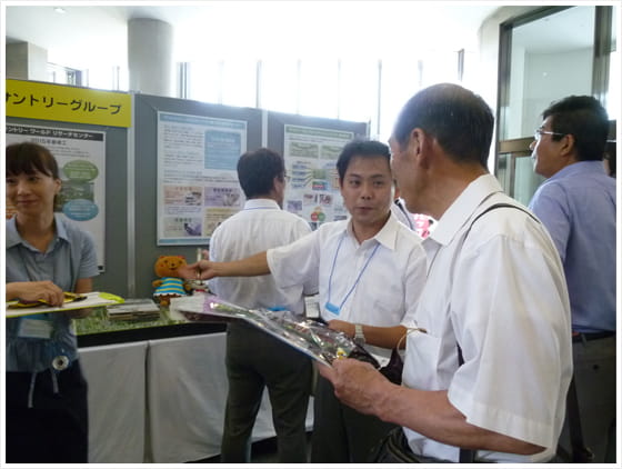 7月、けいはんな学研都市の主な産官学が連携するビジネスマッチング展示会「けいはんなビジネスメッセ」に、サントリーも出展しました。サントリーウエルネス健康科学センターでは、健康食品や健康素材の研究について、研究員が説明を行いました。