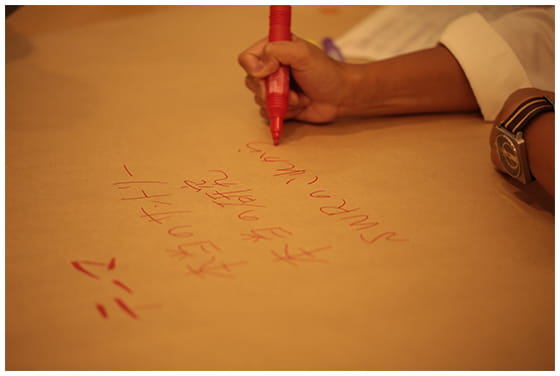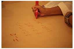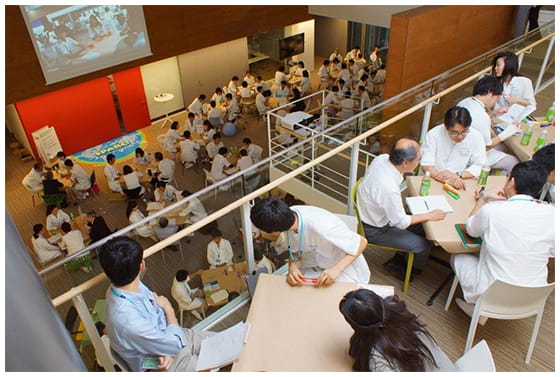 その後、これまでセンター内で行ってきた「ワールド・カフェ※」を応用した「ダイアログ(対話)」を実施。4人1組になり、講話から得た理解をもとに、サントリーの研究者が成すべき本質を掘り下げ、個々から湧き出る「サントリー ワールド リサーチセンターで成し遂げたい想い」を整理し、所信表明を行いました。