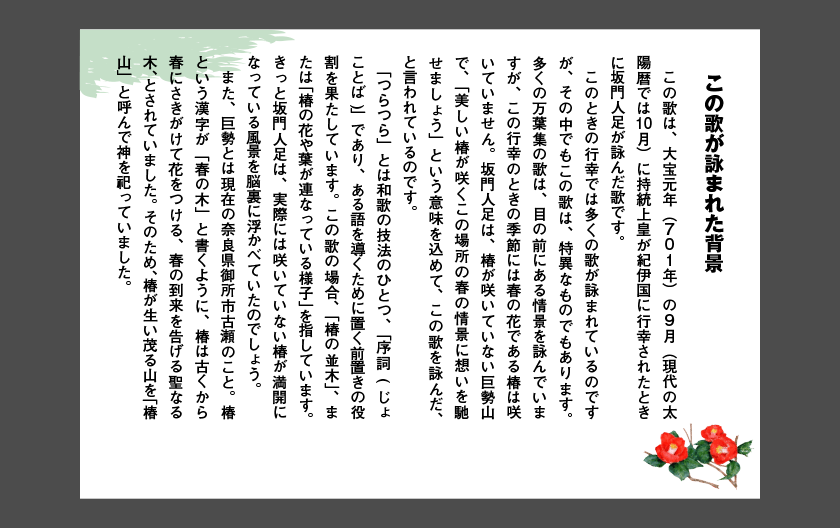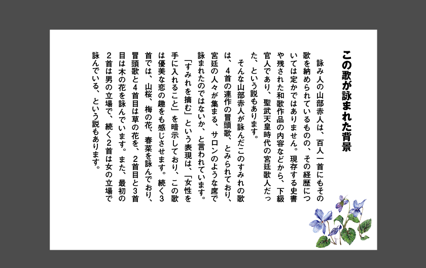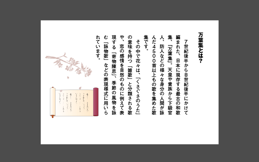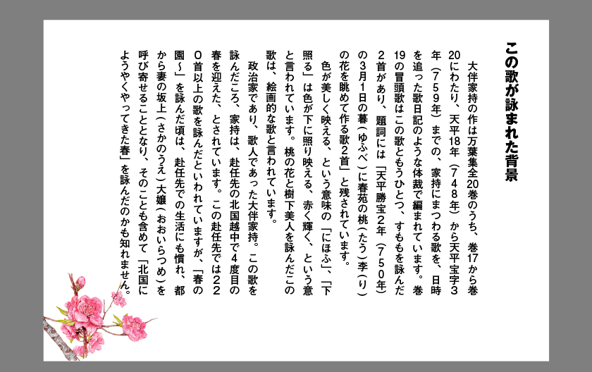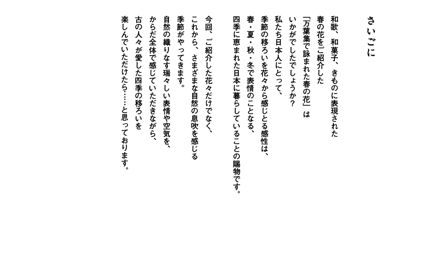 |万葉集の中から、春の花を詠んだ四つの歌に光をあて、日本人に愛されてきた春の花をご紹介いたします。